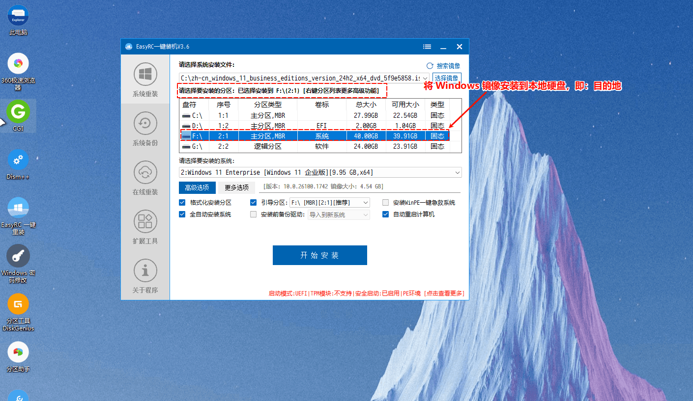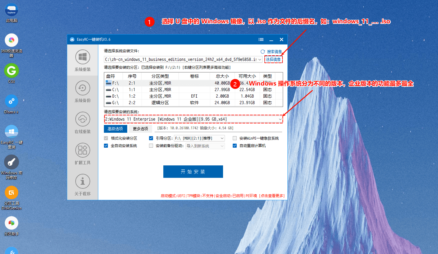- 安装的硬盘是分区之后的硬盘,而不是 WinPE 所在的 U 盘!